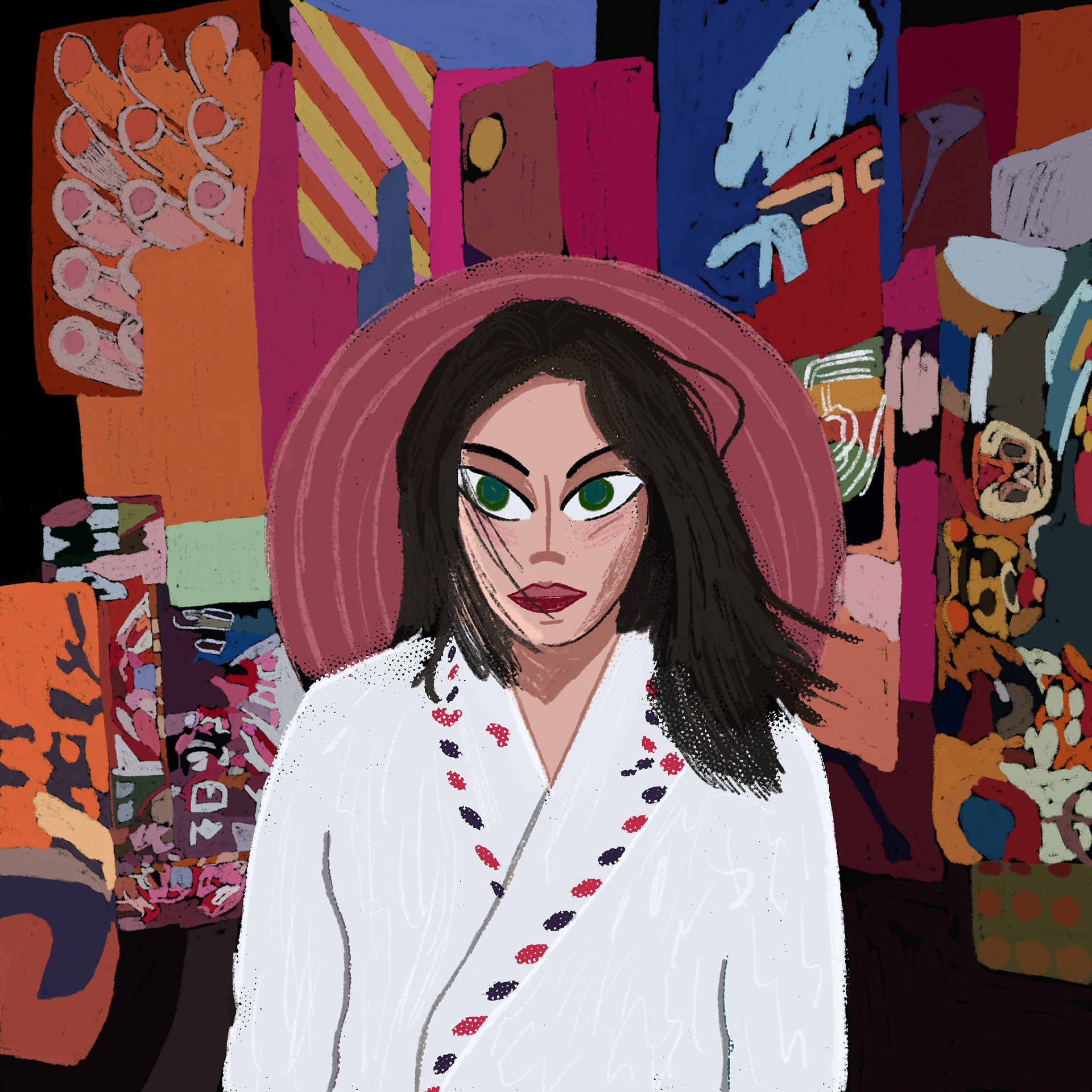 I took majority of my inspiration for this piece from this particular creation by King. I enjoyed the uniqueness of this character's eyes, and how they overlapped slightly with her hair. I applied this same effect slightly to my design, which I illustrated fully in Procreate. I also tried to apply a similar textured-affect to my illustration. I experimented with different brushes to try and get this affect.